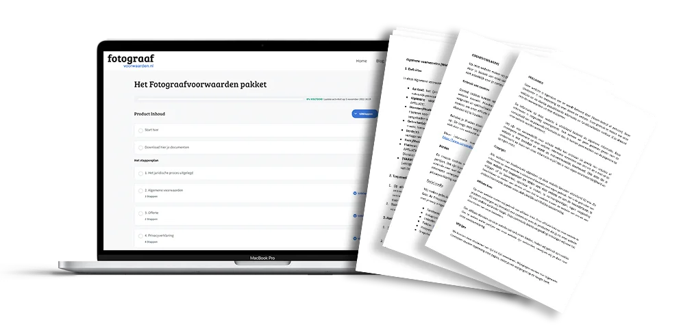 Daarom hebben wij speciaal voor jou, als fotograaf, een volledig pakket ontwikkelt met de juiste documenten. Inclusief handige module zodat jij de documenten stap voor stap op de juiste manier kunt toepassen.